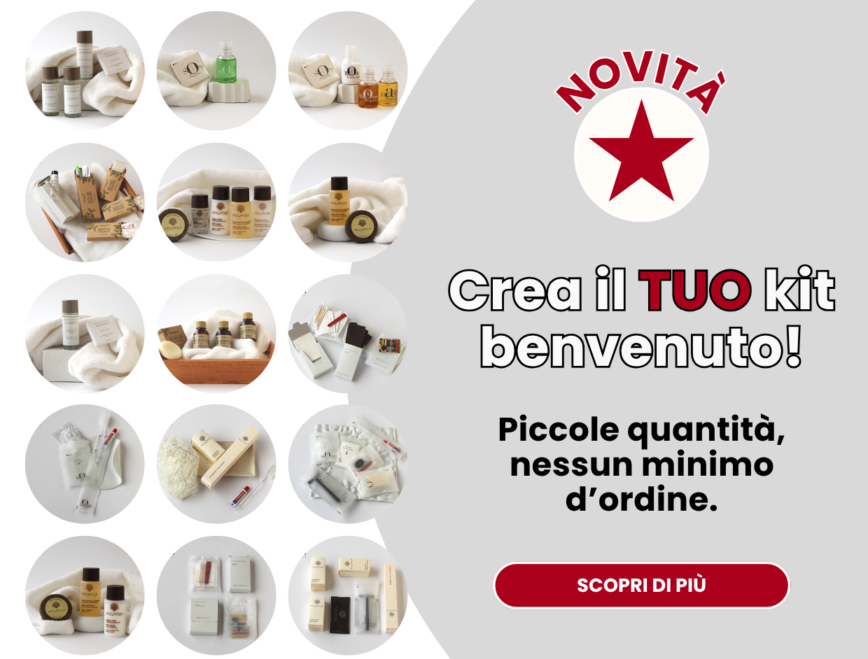A completare l’esperienza di soggiorno, la nostra Linea Cortesia include set di benvenuto personalizzabili con il logo della tua struttura. Prodotti raffinati, sicuri e studiati per trasmettere attenzione e professionalità agli ospiti, anche nei piccoli gesti.