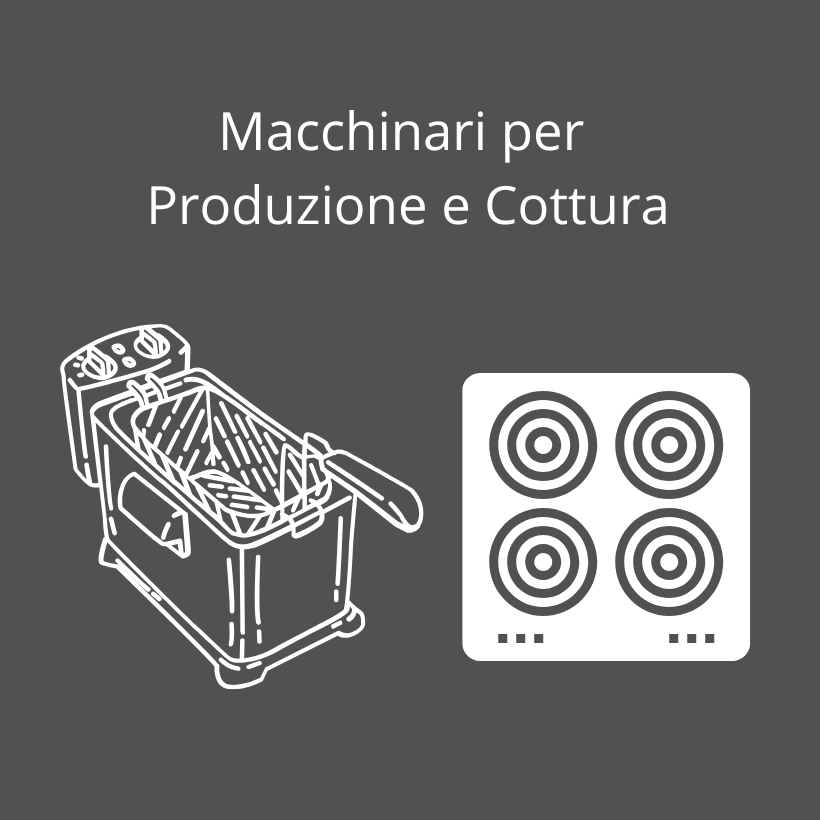 – Produzione e Cottura: attrezzatura professionale per la cottura dei cibi che comprendono friggitrici, piastre grill, piastre ad induzione, cuociriso, essiccatori e tostapane