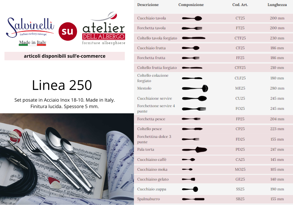 Salvinelli da più di cinquant’anni dedica energie creative e produttive per la realizzazione di posateria ad alto valore. Salvinelli è nata e tutt’ora ha sede a Lumezzane (Brescia) in val Trompia, il distretto storico delle industrie che lavorano i metalli. Propongono posate raffinate per hotel, ristoranti e per una clientela di classe.