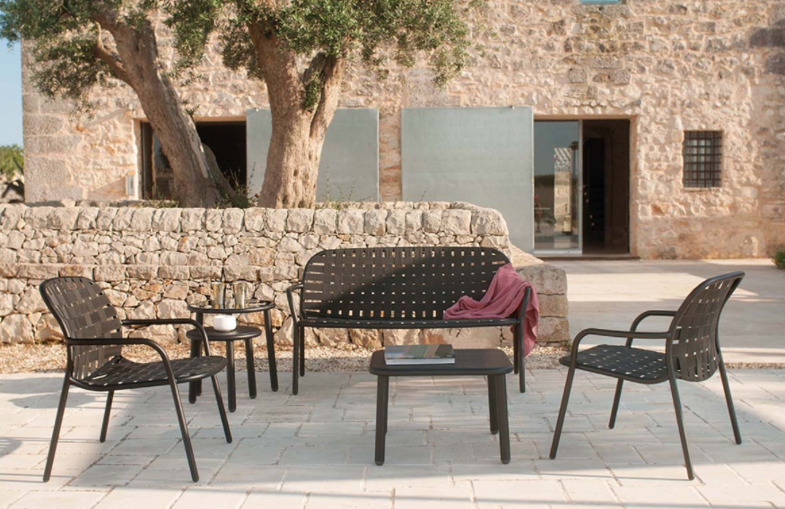 L’intreccio di cinghie elastiche, accoppiate in modo innovativo alla struttura in alluminio dalle linee sofisticate, dá vita ad un insieme dallo stile insolito ed eclettico e dal comfort accentuato, pienamente fruibile per uso esterno.