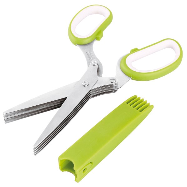 Forbice per Erbe con 5 Lame Cm 20 e pratico accessorio per la pulizia. Forbice in Inox e manico in Polipropilene.
