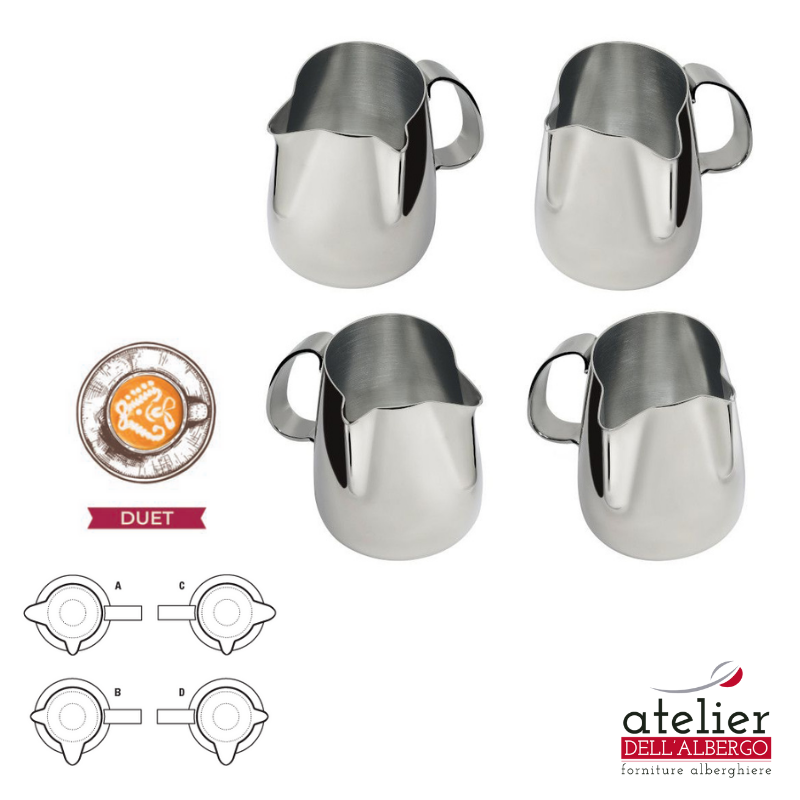 Le diverse forme delle lattiere Duet vanno dunque incontro a tutte le preferenze di utilizzo e alle necessità di impugnatura di ogni barista, sia per destrorso che per mancino. Le lattiere Duet dotate di due becchi differenti consentono di decorare utilizzando stili diversi senza adoperare altri strumenti come il pennino. Infatti, nella preparazione e nella decorazione del Cappuccino il becco più grande può essere utilizzato inizialmente nella fase contrasto, mentre il becco più piccolo può essere utilizzato successivamente in decorazione per eseguire pattern precisi e dettagliati e rifinire il disegno.