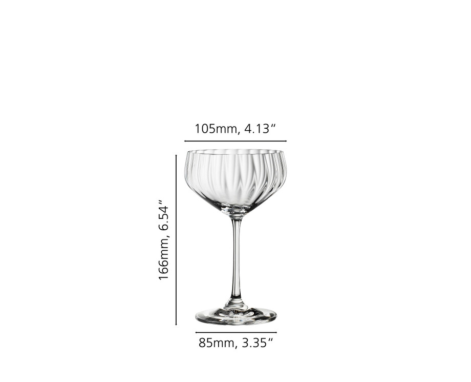 Coupette Coppa Cocktail da 31 cl linea Lifestyle di Spiegelau è pensata per drink che contengono, oltre all’alcool, una piccola percentuale di succo di frutta o un analcolico. Perciò, ha una capacità leggermente maggiore rispetto a un bicchiere da cocktail.
