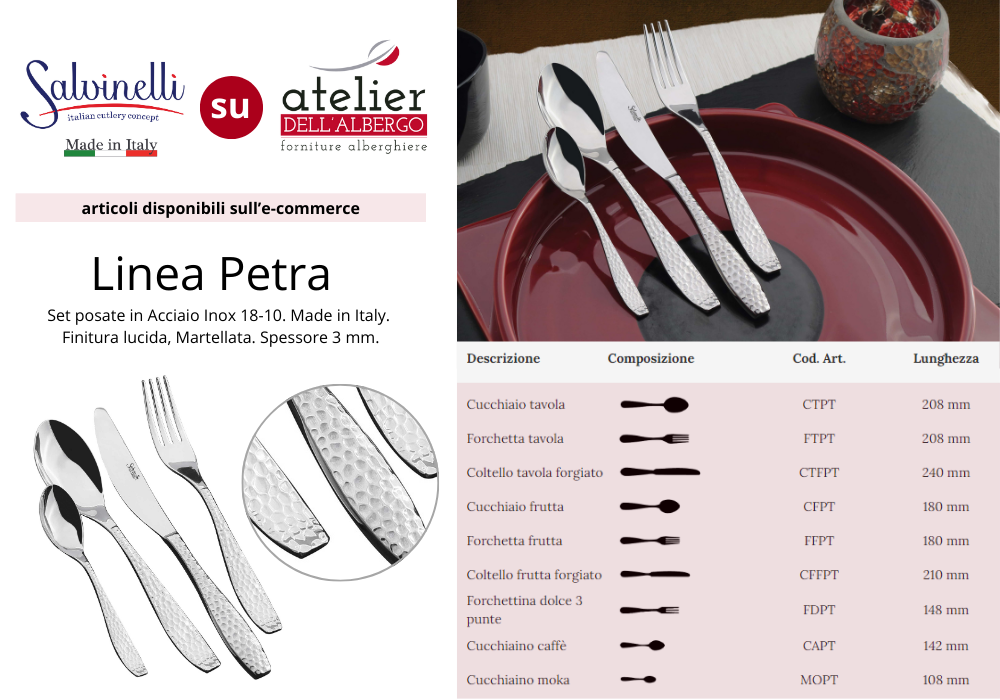Salvinelli da più di cinquant’anni dedica energie creative e produttive per la realizzazione di posateria ad alto valore. Salvinelli è nata e tutt’ora ha sede a Lumezzane (Brescia) in val Trompia, il distretto storico delle industrie che lavorano i metalli. Propongono posate raffinate per hotel, ristoranti e per una clientela di classe.
