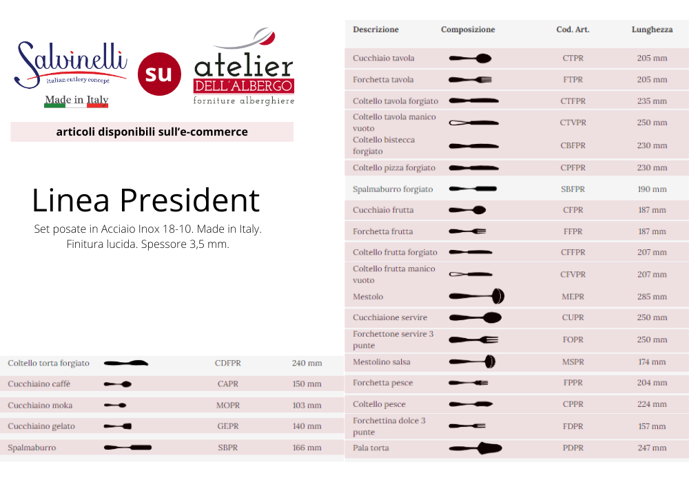 Salvinelli da più di cinquant’anni dedica energie creative e produttive per la realizzazione di posateria ad alto valore. Salvinelli è nata e tutt’ora ha sede a Lumezzane (Brescia) in val Trompia, il distretto storico delle industrie che lavorano i metalli. Propongono posate raffinate per hotel, ristoranti e per una clientela di classe.