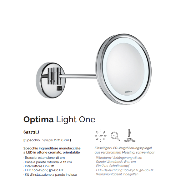 Specchio ingranditore modello Optima Light One, Valera, monofacciale a LED in ottone cromato, da parete, orientabile