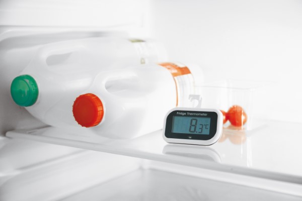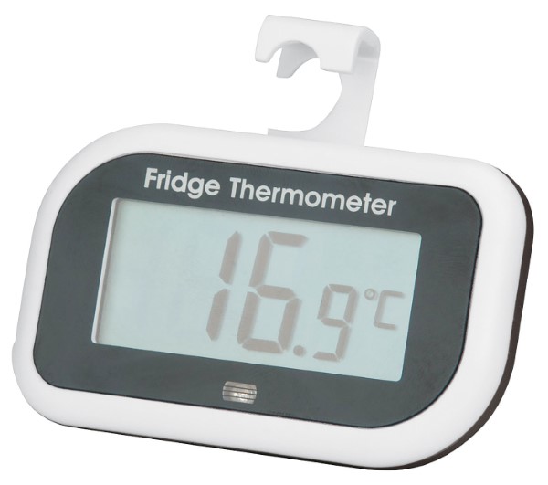 Termometro digitale per frigorifero resistente all’acqua IP65. Un’icona sul display indica quando la temperatura è al di fuori dell’intervallo da 0° a 5°C. Range -9,9 +49,9°C, Div 0,1°C, dimensioni 2,6 x 4,5 x 7,3 cm