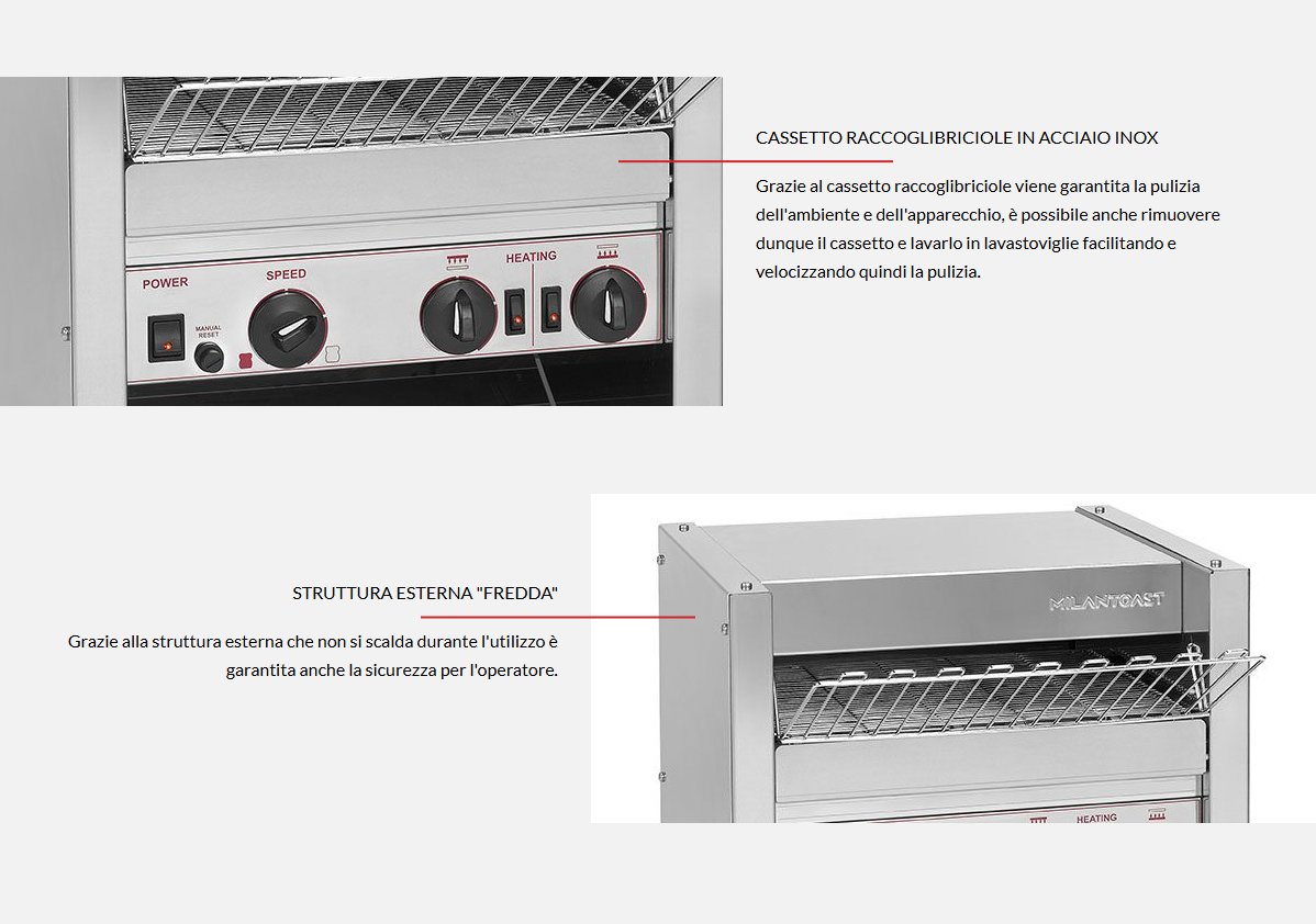 Struttura esterna fredda in acciaio inox e stabili elementi riscaldanti in acciaio inossidabile che garantiscono una lunga durata. Nastro trasportatore e cassetto raccoglibriciole in acciaio inox a tutta lunghezza, lavabile in lavastoviglie facilitando e velocizzando quindi la pulizia dell’ambiente e dell’apparecchio.