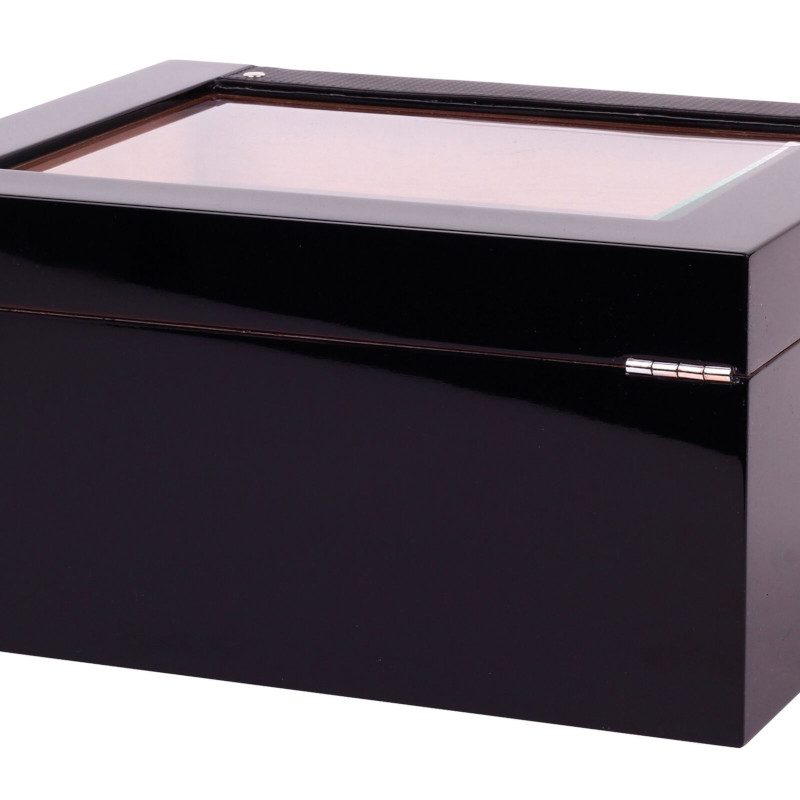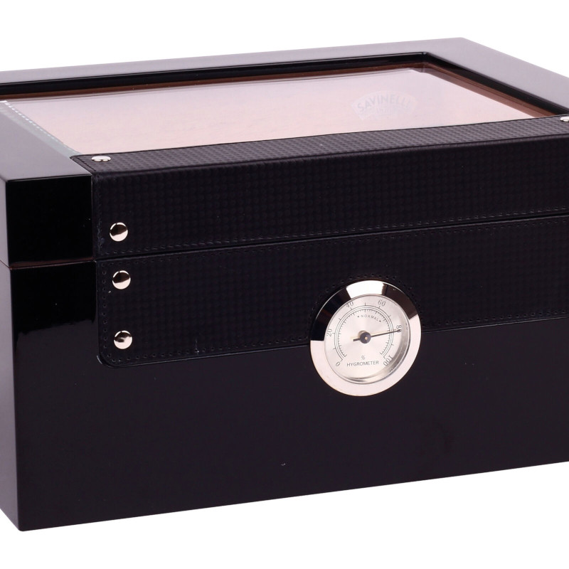 Vetrina sigari, per circa 50-75 sigari in relazione al ring del sigaro, dotato di igrometro incorporato. Interno in cedro. Divisori interni removibili.
